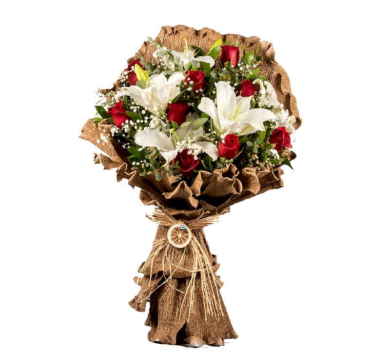 9 adet kırmızı gül ve 6 adet beyaz lilyum çiçekleri ile hazırlanmıştır. Yeşillik ve beyaz cipsofilya çiçekleri ile zenginleştirilmiştir. Dış hediye paketi ithal craft malzemesi ile yapılmıştır. Tamamlayıcı olarak aşı ipi ve kurutulmuş portakal kabukları ile tasarımı tamamlanmıştır. Eşinize,ailenize,sevdiklerinize gönderebileceğiniz premium buketlerdendir. İsteme çiçeği,söz çiçeği,evlilik teklifi, yıldönümü, takdim merasimi için de en uygun hediye çiçeğidir. Serin bi yerde muhafaza ederek maximum ömür seviyesine taşıyabilirsiniz. Eskişehir çiçek eskişehire çiçek gönderme de en hızlı ve en güvenilir adrestir. Eskişehirdeki çiçekçiler arasında öncü konumdadır. Eskişehir çiçekçi