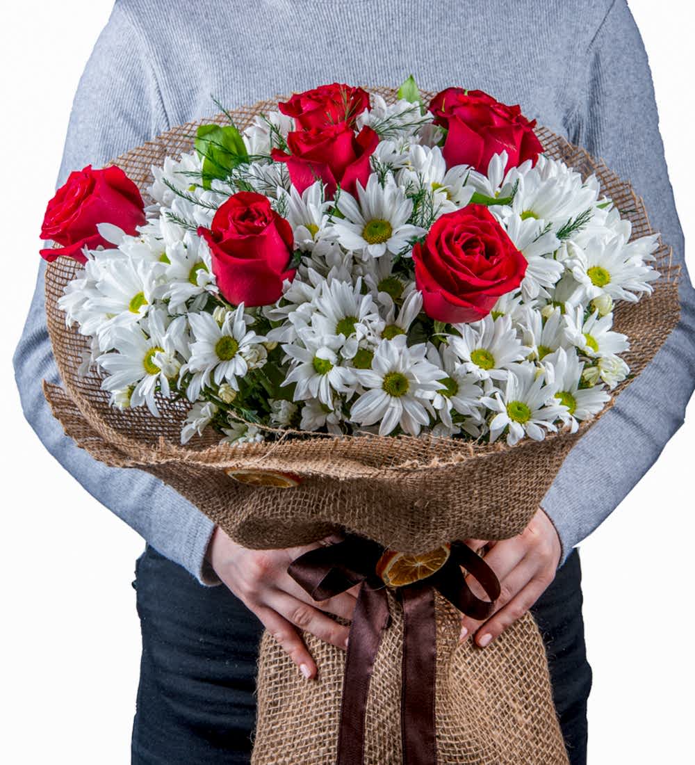 Beyaz papatya buketinin içine 5 adet kırmızı gül ile hazırladık. Hediye paketini ithal burlap malzemesinden yaptık. Buketin içine beyaz cipsofilya çiçekleri ve okaliptüs yaprakları ile zenginleştirdik. kahverengi saten kurdela ve kurutulmuş portakal kabukları ile tasarımını tamamladık. Yaklaşık olarak 40 adet papatya ve 5 adet kırmızı gül ile hazırladık. Bazen krizantem olarak karşımıza çıkar, bazen de kasımpatı olarak. Beyaz papatya saflık,temizlik,masumluk anlamına gelir. Doğum günü, yıldönümü, geçmiş olsun çiçeği,yeni iş tebriği gibi özel anlarınıza size eşlik edecek harika bi hediyedir. annenize, eşinize, sevdiğinize, gönderebilirsiniz. Serin bi yerde muhafaza ederek maximum ömür seviyesine taşıyabilirsiniz. Eşinize,arkadaşınıza sevdiklerinize doğum günü çiçeği olarak,tebrik çiçeği olarak gönül rahatlığı ile gönderebilirsiniz. Eskişehir çiçek eskişehire çiçek gönderme de en hızlı ve en güvenilir adrestir. Eskişehirdeki çiçekçiler arasında öncü konumdadır. Eskişehir çiçekçi