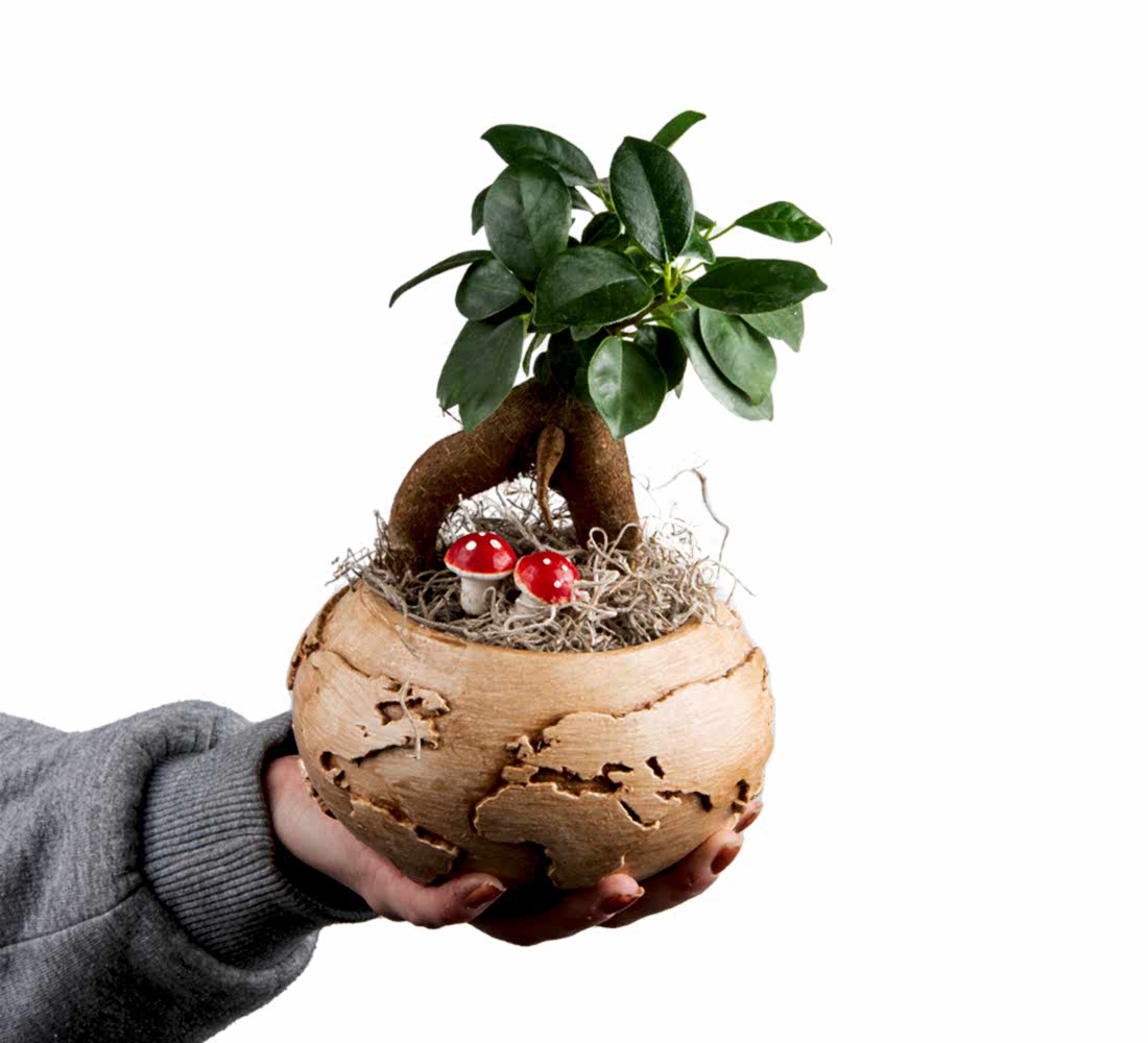 Dünya şeklindeki saksı içerisine ficus gin seng bonsai ile hazırlanmıştır. Saksının üzeri kurutulmuş thillandsia yaprakları ile kaplanmıştır. Yardımcı malzeme olarak minyatür mantar objeleri kullanılmıştır. Ürün yaklaşık olarak 25 cm yüksekliğindedir. Sulaması için haftada bi kez 1 çay bardağı kadar suyu çiçeğin dibine vermek gerekir ve nemlendirmek için 2-3 günde bir yaprakları ve gövdesine su püskürtmeniz gerekir. Eskişehir çiçek eskişehirdeki çiçekçiler arasında yenilği takip eden öncü bir firmadır. Eskişehire çiçek göndermek için en hızlı ve güvenilir firmadır. Eskişehir Çiçekçi